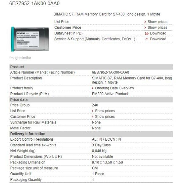 6ES7952-1AK00-0AA0 6ES7 952-1AK00-0AA0 Siemens Memory Card Images |