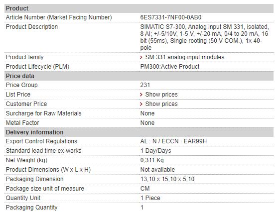 | Alternate Part Number | 6ES7331-7NF00-0AB0 |