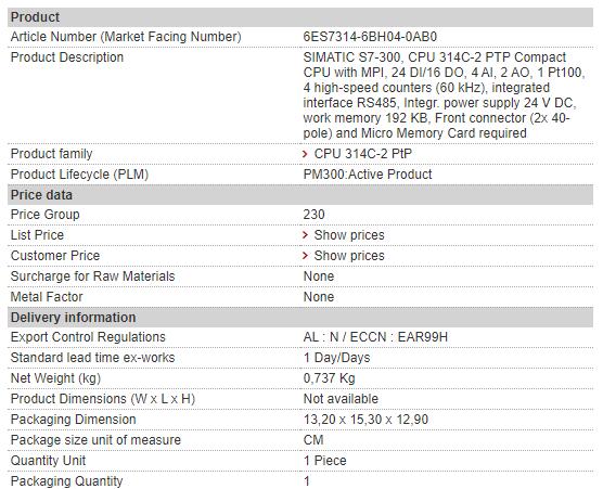 | Alternate Part Number | 6ES7314-6BH04-0AB0 |