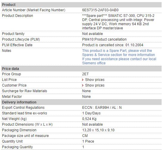 | Alternate Part Number | 6ES7315-2AF03-0AB0 |